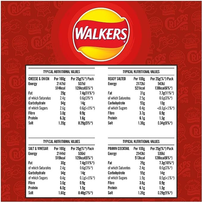 Bulk-buy Walkers Crisps by the case to keep your family satisfied. Each case contains 60 packs and includes flavours: Cheese & Onion, Salt & Vinegar, Ready Salted and Prawn Cocktail.
